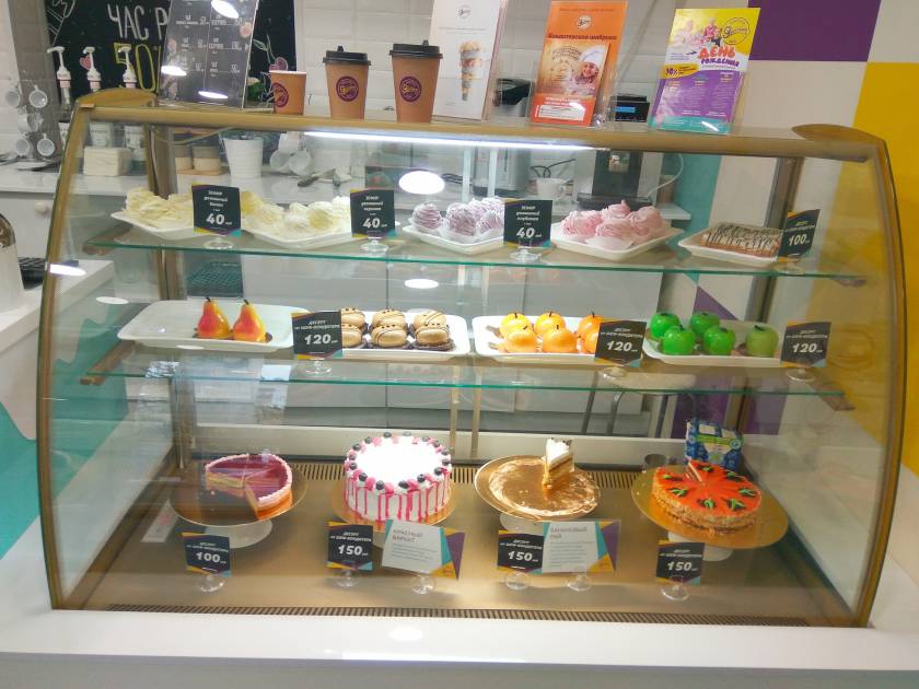 “Первое, что мы видим – это витрина с десертами. И надо сказать, что пирожные очень красивые и необычные, в форме фруктов, плюс торты и зефир (наличие зефира меня особенно обрадовало). Само помещение небольшое, но оформлено в ярких тонах. Свежо, достаточно сочно. Есть зона для фотографирования. Мне показалось, что немного мало мест.”