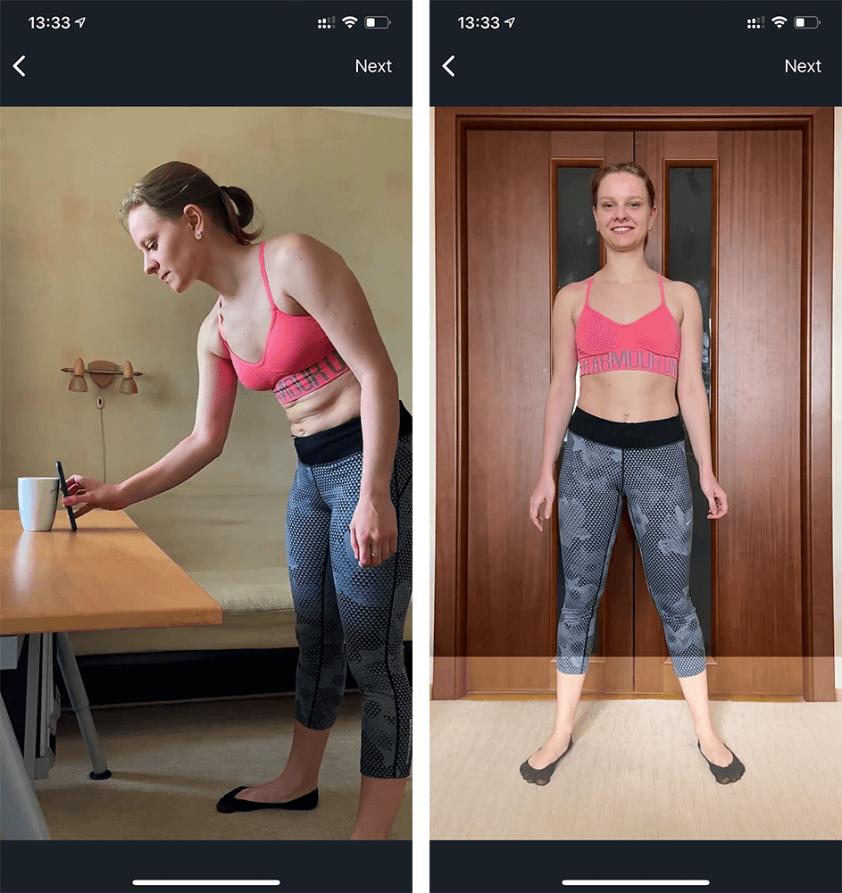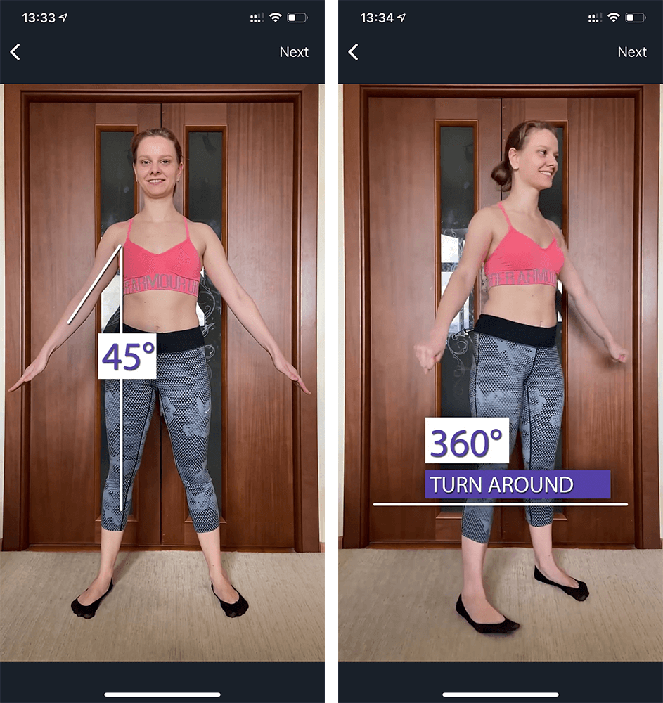 Если вы все сделали правильно, приложение предложит перейти к сканированию тела. Для сканирования тела установите iPhone или iPad на уровне чуть ниже пояса и отойдите, чтобы поместиться в кадре во весь рост. Расположите руки под углом 45 градусов к телу и сожмите ладони в кулаки.