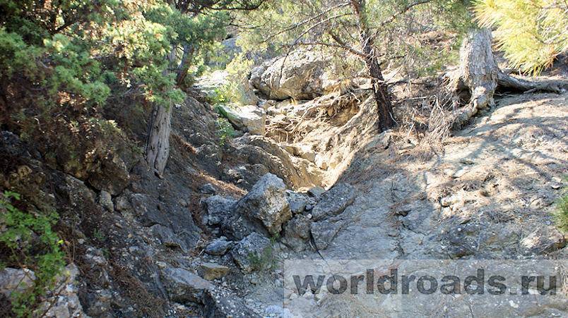 Дальше – спуск в расщелину по скальным выступам, фактически по каменным ступеням. Как будто природе было жалко не показать свои красоты людям, и она предусмотрела удобный спуск.
