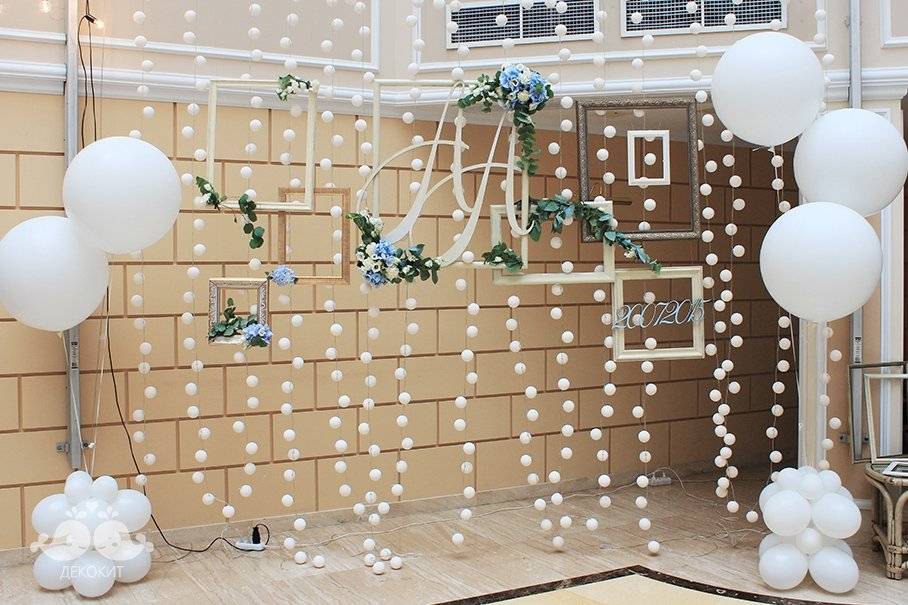 Солидным украшением для больших грандиозных праздников будут большие каркасные арки, объемные фигуры и длинные гирлянды. Самая распространенная идея – подвижная арка «нитка жемчуга». Декор для фотозоны создается способом простого нанизывания предварительно связанных шаров на леску. Более сложная конструкция подразумевает крепление шаров к металлическому стенду.
