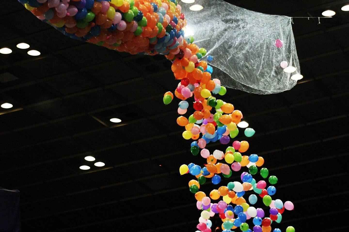 Веселое развлечение для детей и взрослых. Смысл заключается во внезапном лопанье огромного шара, подвешенного под потолком. В него закладывают специальный безопасный детонатор и взрывное устройство. В самый торжественный момент он срабатывает и весь пол становится усыпанным яркими шариками. Из него вылетает множество мелких деталей разного размера, цвета и дизайна.