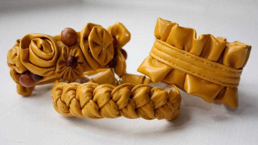 Изделия из кожи смотрятся стильно и необычно. Работать с натуральной кожей очень приятно, хоть и требуется определенная сноровка. Мастера, создают целые картины, натягивая и выкрашивая кожу в нужный цвет. Можно сделать объемные цветы или другие предметы, фантазия безгранична. Материал, можно купить в магазинах ткани, или распороть ненужный сапог.