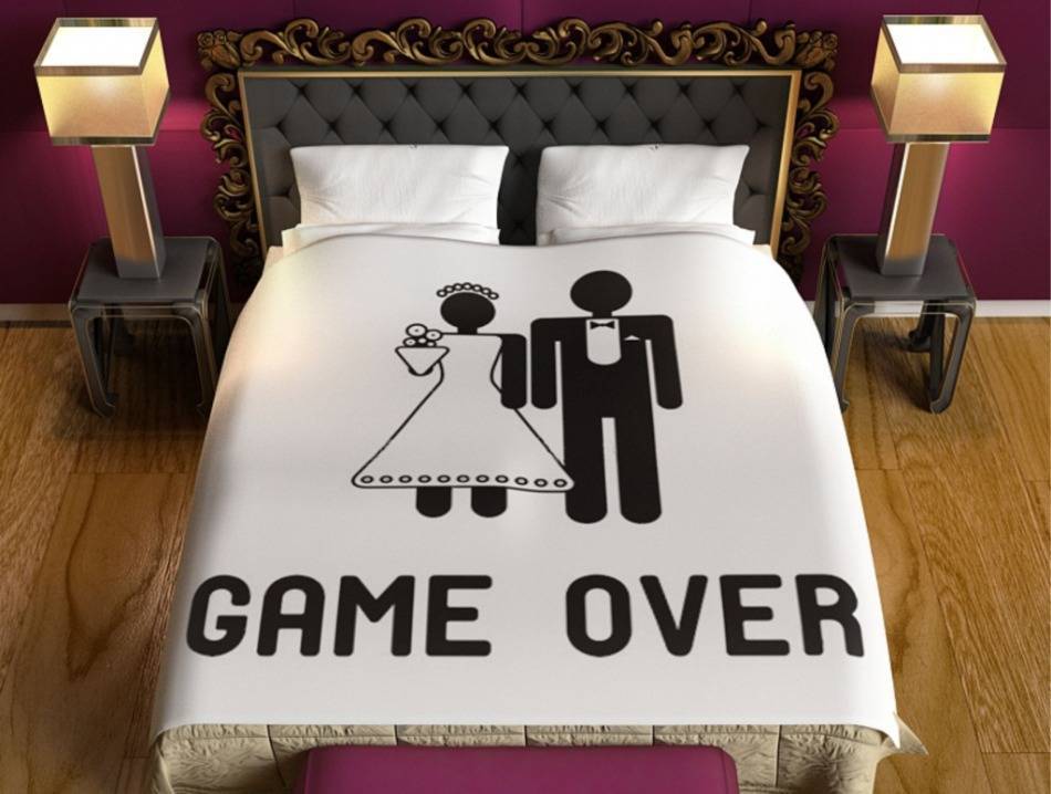 - постельное белье с изображением семейной пары и надписью: «Конец игры»