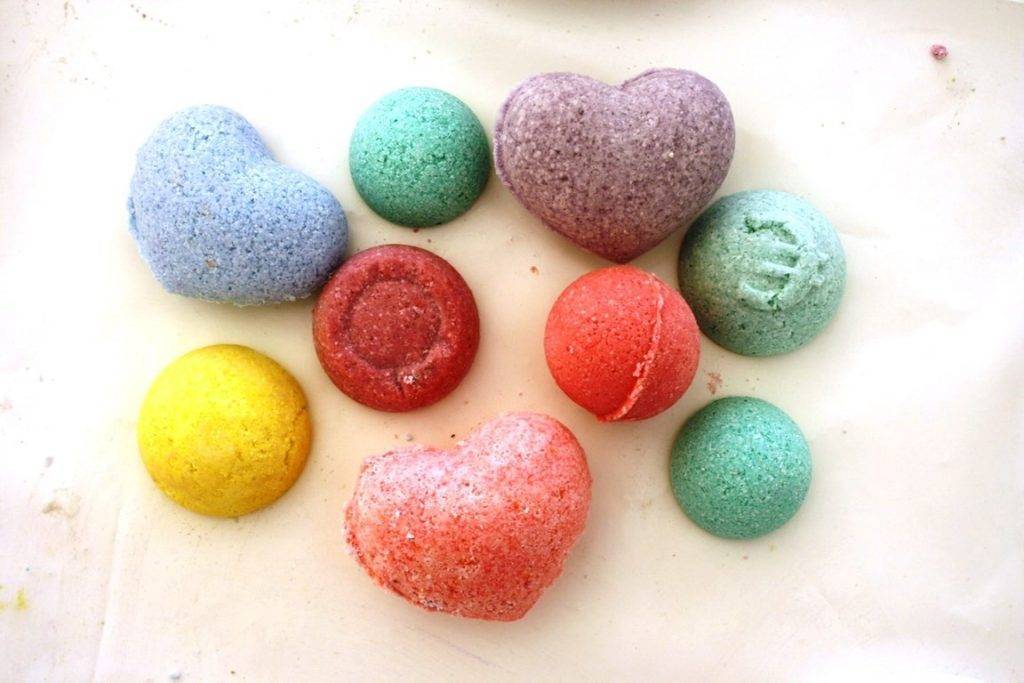 Самодельные «шипучки» получится сделать за 10-15 минут, поэтому их легко сделать в домашних условиях. Это без учета времени для застывания формы, и просушивания готового изделия. Из дополнительных ингредиентов часто используют сухие травы, морскую соль, целебные грязи, глину. Но не все компоненты подходят для детских бомбочек.
