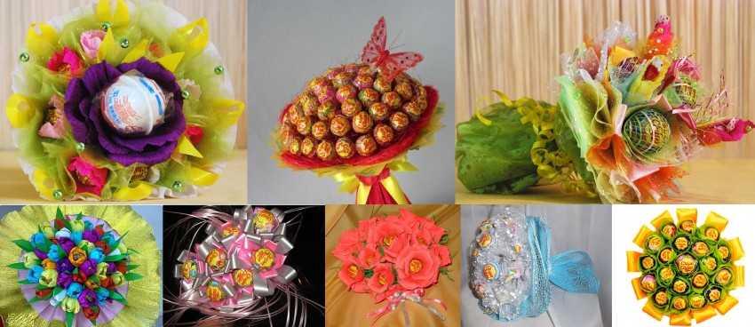 Хотите сделать оригинальный букет из чупа-чупсов своими руками? Среди огромного разнообразия композиций есть и букеты из фруктов, мягких игрушек, шоколадных конфет, текстильных и ленточных композиций (канзаши), бисерных цветов и др.