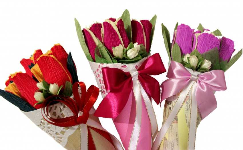 Такой сюрприз покорит сердце любой женщины, начиная с детсадовского возраста. Если вы не знаете, что дарить на предстоящий праздник представительнице слабого пола, смело подхватывайте идею. Сладкий цветочный букет в превосходном исполнении покорит даже самое холодное сердце. Итак, рассмотрим некоторые варианты.
