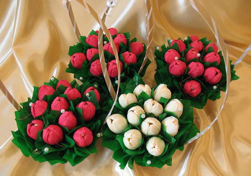 - Чтобы букеты из сладостей своими руками не растаяли во время церемонии, используют твердые конфеты или плотный слой фольги;