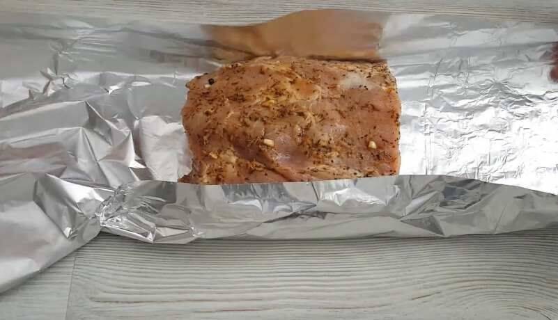 - Поместить на фольгу и плотно обмотать ею мясо.