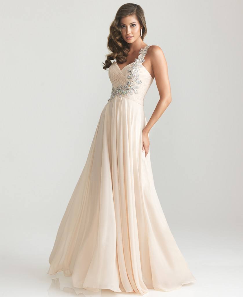 Во многом повторяющий силуэт греческой модели, ампир – классика вечернего нарядного платья. Подчеркнутый лиф, открытые плечи, юбка длиной в пол, все это изготовлено из дорогой однотонной ткани и должно быть украшено, дабы подтвердить благородство владелицы. Украшения могут быть как на самом платье (пайетки, стразы, отдельные жемчужины), так и оттенять гладкую кожу плеча, шеи, рук. Стиль ампир прекрасно подходит для любого типа фигуры, на женщинах полных он смотрится особо привлекательно.