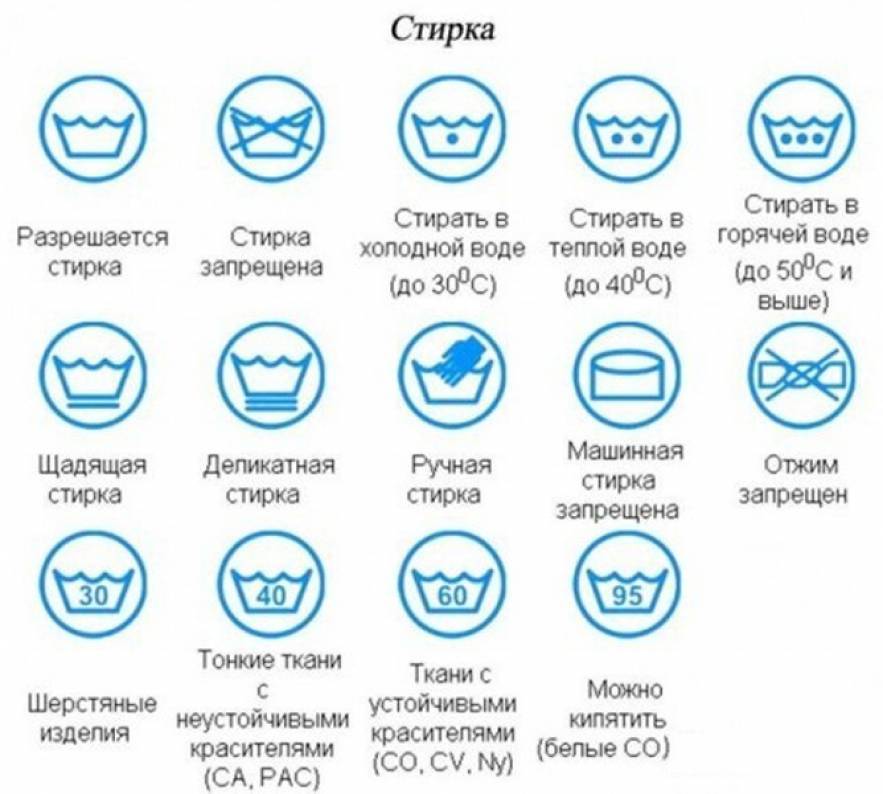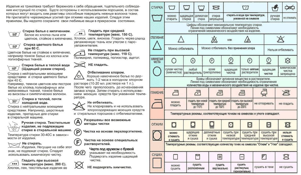 Как видно, значки по уходу за одеждой и расшифровка символов на ярлыках не так и сложны, зато соблюдение рекомендаций производителя по уходу способно облегчить уход за вещами и продлить их существование в отличном состоянии. Правильный уход позволяет сохранять цвет и форму вещей со стабильным размером без растягивания и целостностью швов.