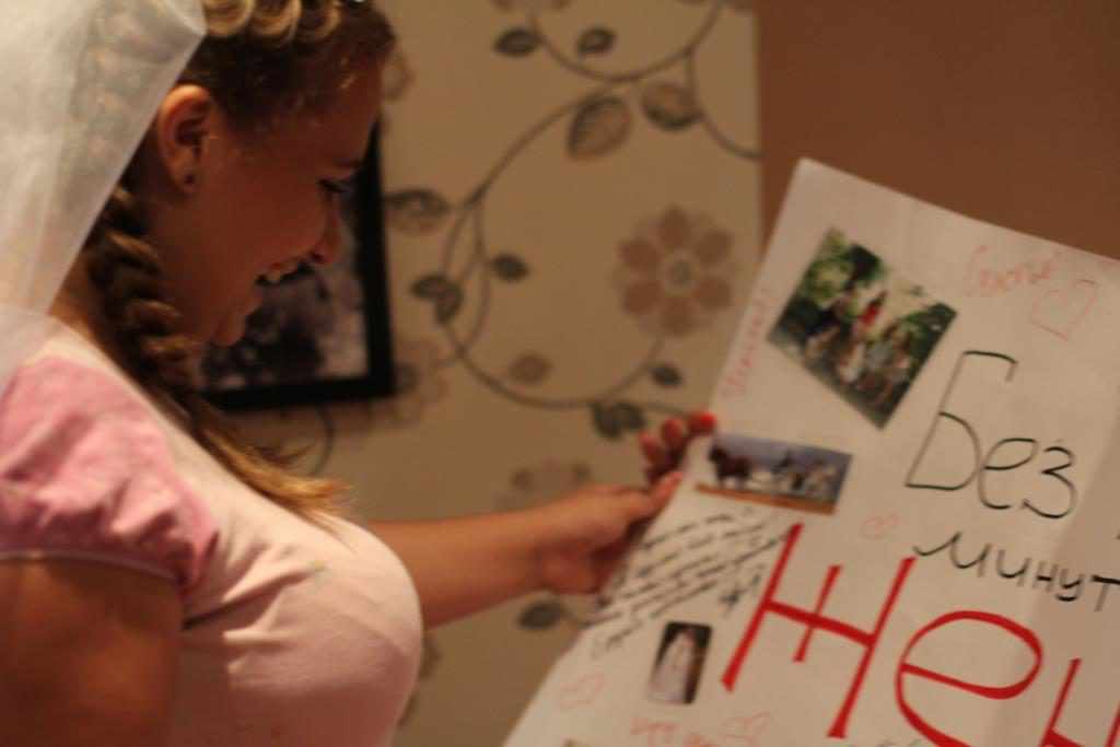 Можно изготовить открытку, которая будет предназначена только невесте. Написать смешной или трогательный текст, или придумать стихотворение.