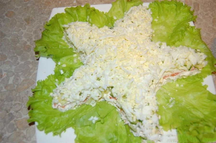 Третий слой – тертый белок и половина тертого желтка. Снова все смазываем майонезом и сверху присыпаем тертым сыром. После этого его необходимо убрать на час в холодильник для дополнительной пропитки, после чего салат готов!