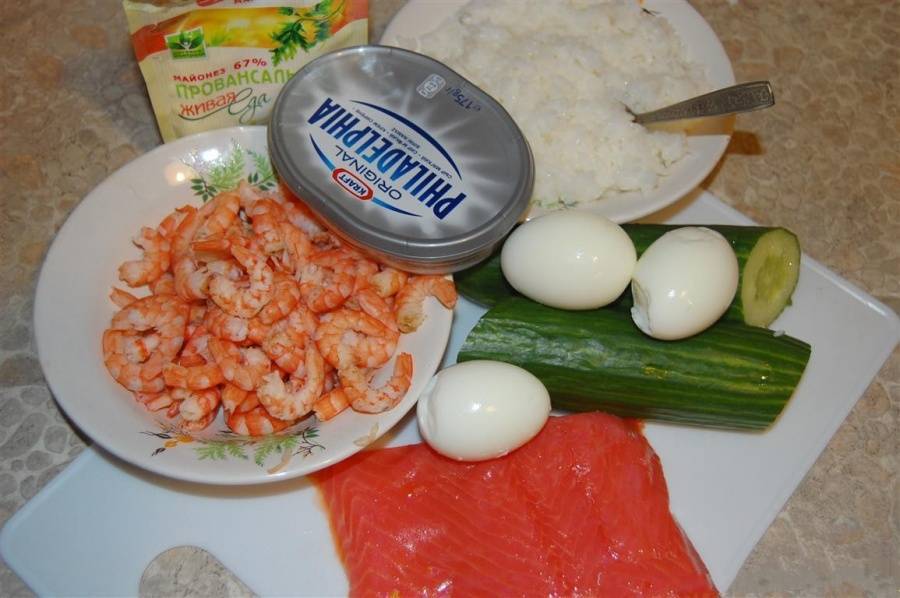 В первую очередь нам нужно предварительно заготовить продукты для нашего салата.Креветки отвариваем и оставляем их, чтобы они остыли. Чистим.Варим до полного приготовления рис.Приготовить семгу.