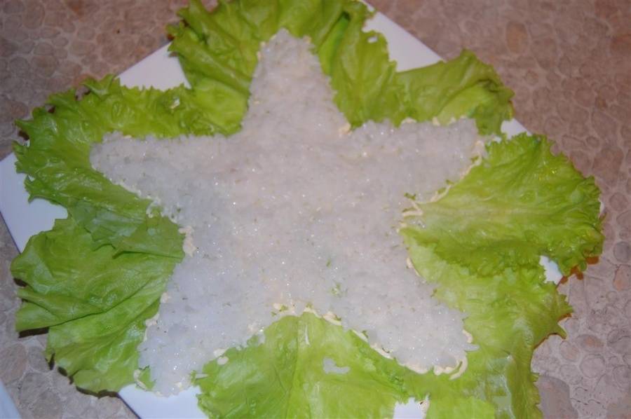 Чтобы сформировать салат, нам нужны листья салата. Раскладываем листья на большую тарелку. Теперь берем майонез и поверх листьев, нарисуем звезду. Так нам удобнее формировать салат.И первым слоем выложить рис.