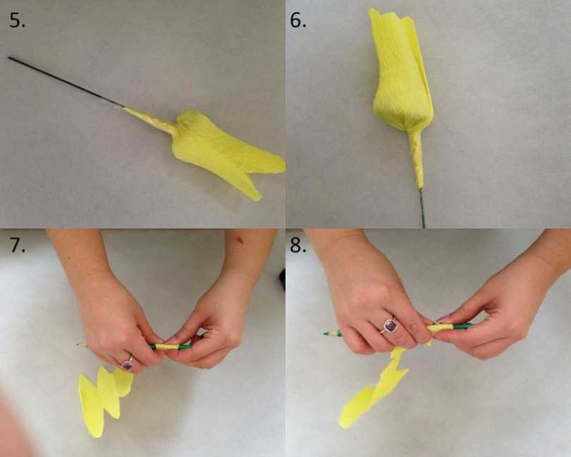 Процесс сборки — творческое занятие - Берем длинную узкую полосу зеленой гофрированной бумаги (шириной около 1 см, длиной — см 20-30 — зависит от длины стебля). Обматываем основание цветка, затем плавно переходим на стебель. В конце закрепляем край бумаги каплей клея.