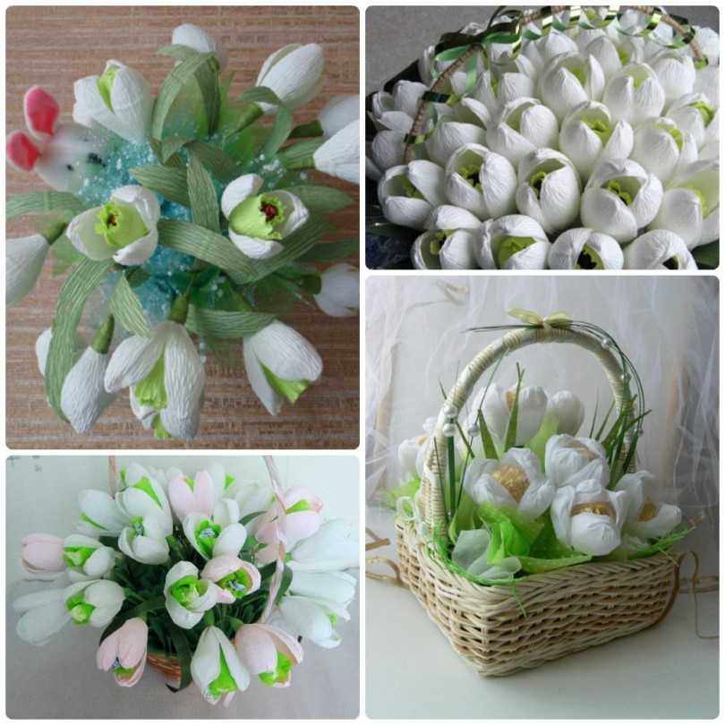 Нежный букет из цветной креповой бумаги станет великолепным дополнением к подарочному набору в коробке. Тем более, что каждый подснежник таит в себе сюрприз.
