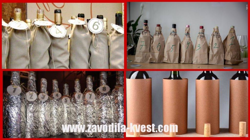 Дегустация вслепую — это способ дегустации, когда бутылки с напитками помещают в специальные мешочки (либо бумажные пакеты) и тем самым скрывают этикетку и весь ее внешний вид.Слепая дегустация работает лучше всего, когда вы хотите сравнить различные сорта винограда, такие например как Шардоне, Шираз или Пино Нуар.В случае того, если ваши друзья не достаточно хорошо разбираются в винах, чтобы отличать марки по вкусу, тогда дегустация вслепую будет оригинальным ходом, так как ваши гости будут меньше обращать внимания на название вина, его марку и этикетку, а больше прислушиваться к своему вкусу. В данном варианте для такой дегустации неплохо напечатать некоторые короткие описания изготовителя, качества и вкуса вина, чтобы помочь гостям выбрать правильное направление. К примеру – белое десертное вино, имеет глубокий золотой цвет с богатым ароматом абрикоса, персика или ананаса. Или к примеру сухое вино со сливочным послевкусием. Наливая вино в бокалы, старайтесь чтобы никто не видели ваши заметки, на бутылках, так ваши гости будут ссылаться только на свои вкусовые ощущения, а не ориентировать свой вкус по этикетке. После дегустации каждого отдельного вина ваши гости смогут сравнить описание вкуса с заметками на бутылке и тем самым определить, кто наиболее точно смог описать тот или иной вкус. Прелесть слепой дегустации еще в том, что уже устоявшиеся предпочтения и вкусы ваших гостей могут кардинально измениться.По вашему желанию можно сделать идеи дегустации вина с трудными или легкими заданиями. Вы можете рассказать всем вашим гостям о стране происхождения каждого вина или о сорте винограда, в качестве начальной подсказки. На фото ниже вы видите оригинальную упаковку, которую необходимо использовать в момент проведения дегустации в слепую.
