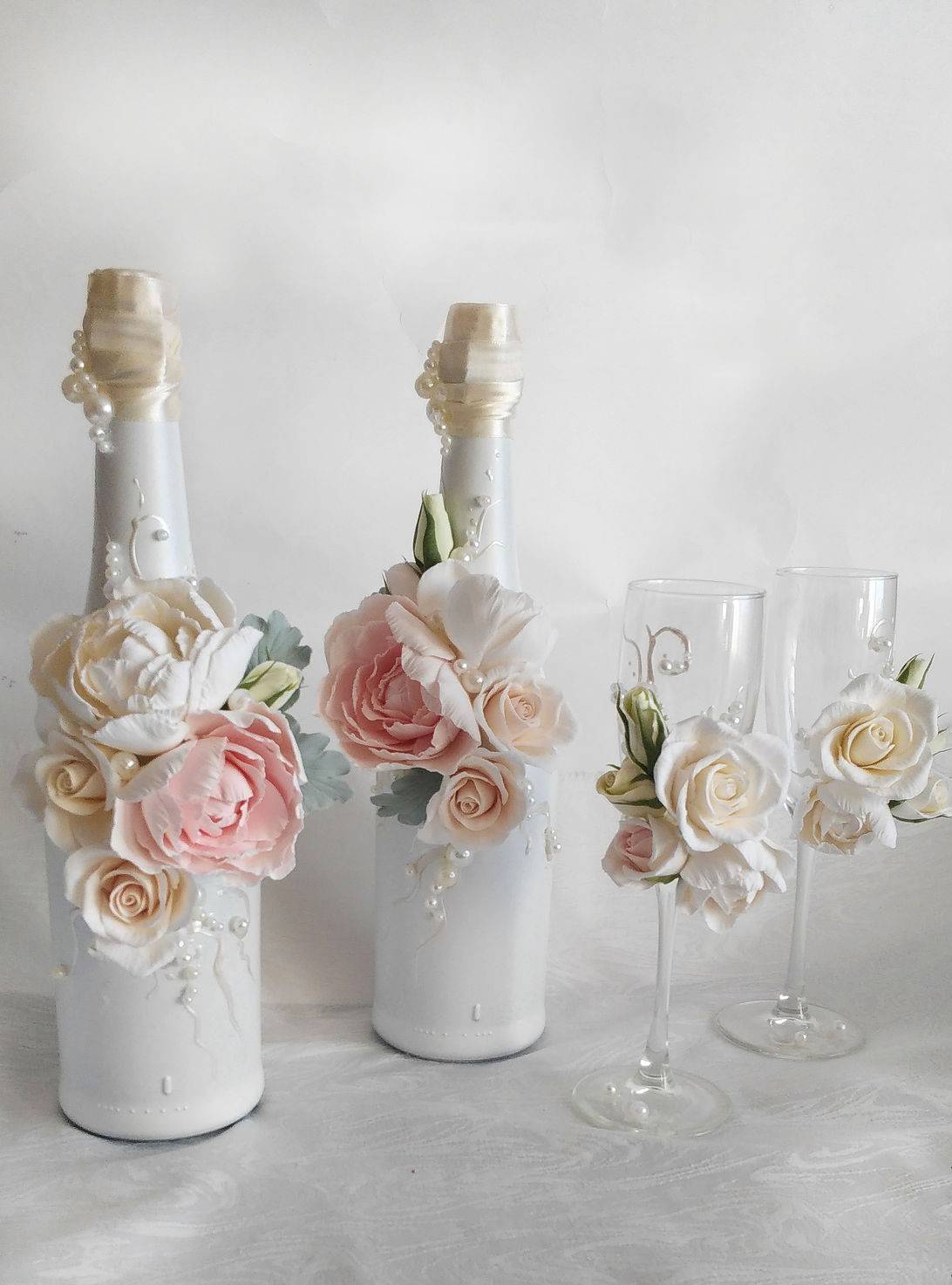 Дизайнерский свадебный декор. Стоит отметить, что свадебные бокалы и саму бутылку принято хранить на протяжении всей семейной жизни.