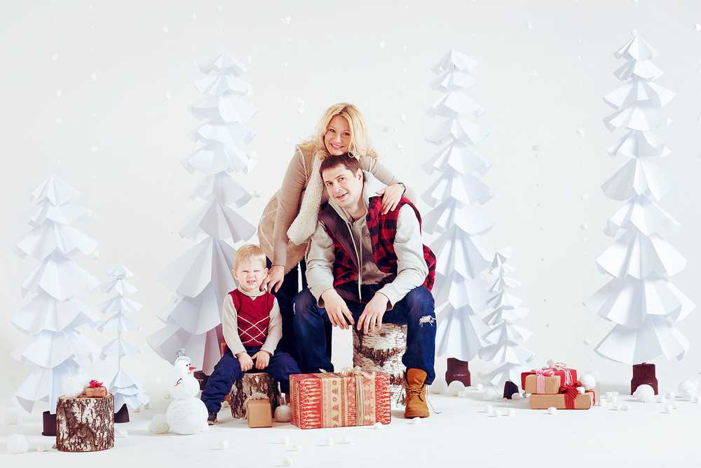 - Для семейной фотосессии можно попробовать позу «горка». Мама должна сесть на пол, сзади располагается папа и держит малыша на плечах. Фотография будет смотреться особенно выигрышно на фоне новогодней ёлки.