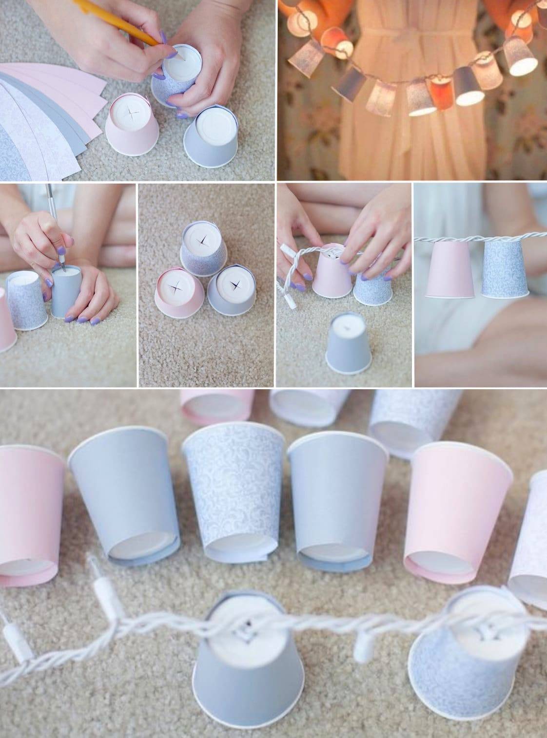 Гирлянду с фонариками сложите в несколько слоев с одинаковыми промежутками. Зафиксируйте ниткой каждый промежуток по три ряда фонариков. Затем оберните эти участки пленкой в виде конфет. Красота для сластен готова.