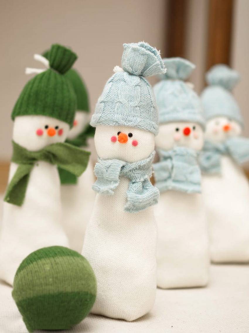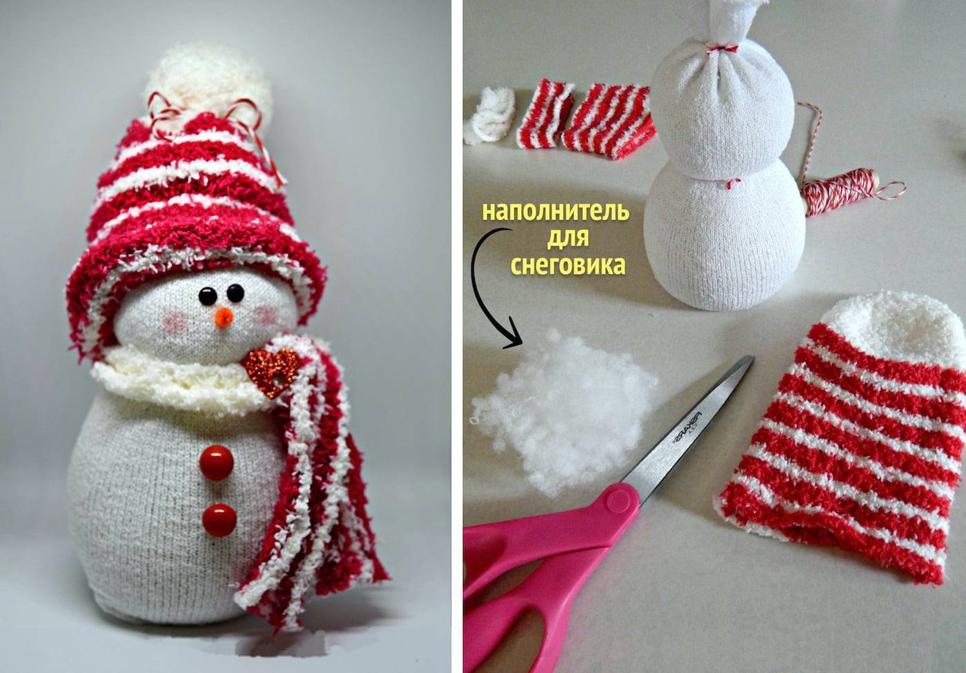 Роль забавного подарка для гостей или украшения журнального столика может исполнить снеговик, для которого потребуется белый носок.