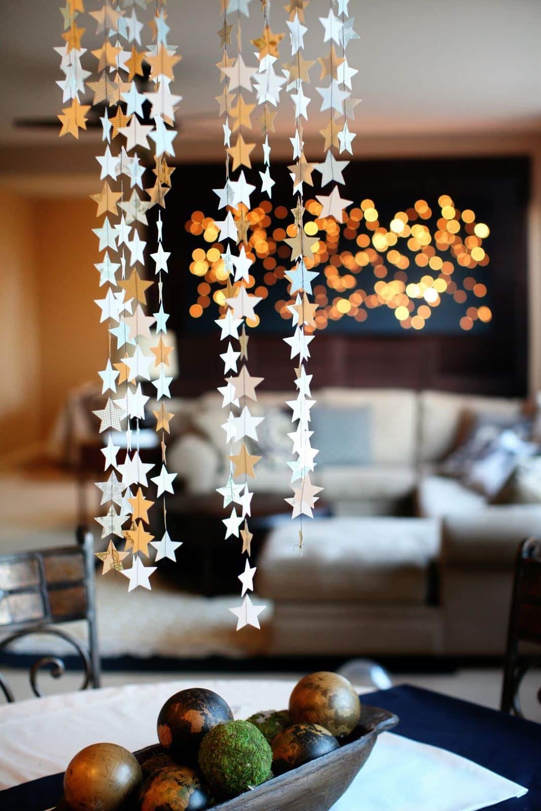- На потолок крепят нитки, с которых свисают легкие украшения: воздушные шары, объемные складывающиеся бумажные игрушки, кусочки ваты, имитирующие снежные хлопья, гирлянды.
