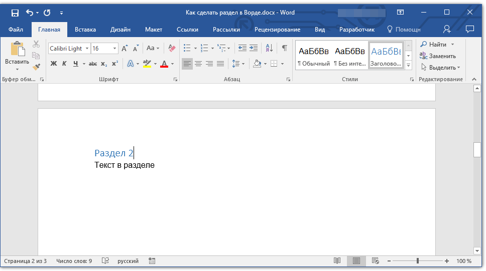 3. Документ будет разделен на два раздела с помощью принудительного разрыва страницы.