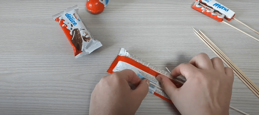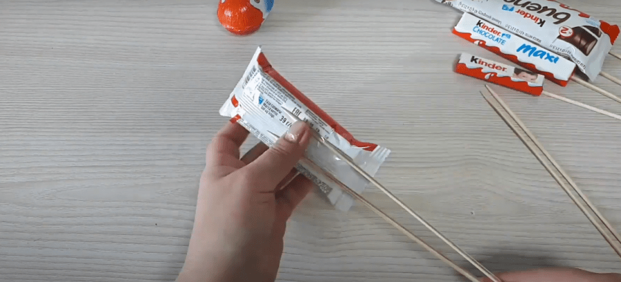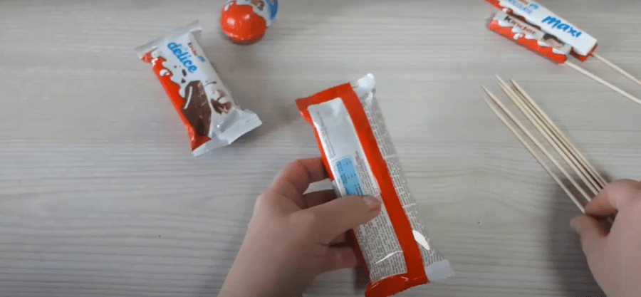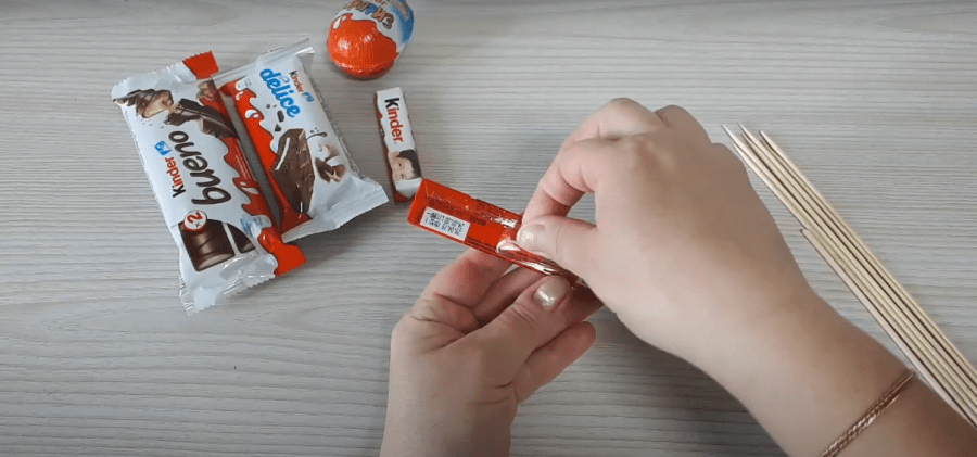 Все конфеты киндер-шоколад необходимо выложить в одну линию
