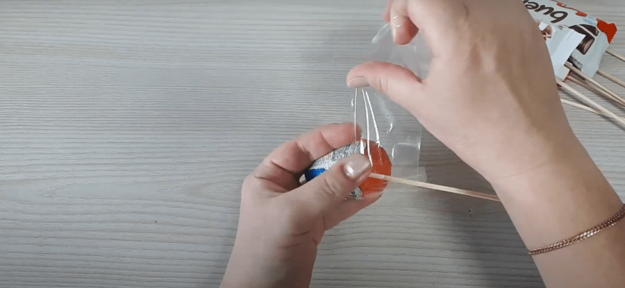 Каждую конфету приклеить к деревянной шпажке. Из органзы вырезать небольшие квадраты, сложить их вдвое, и обернуть каждую из конфет. Ткань закрепить горячим клеем. Снизу каждую конфетку подвязать тонкой ленточкой.