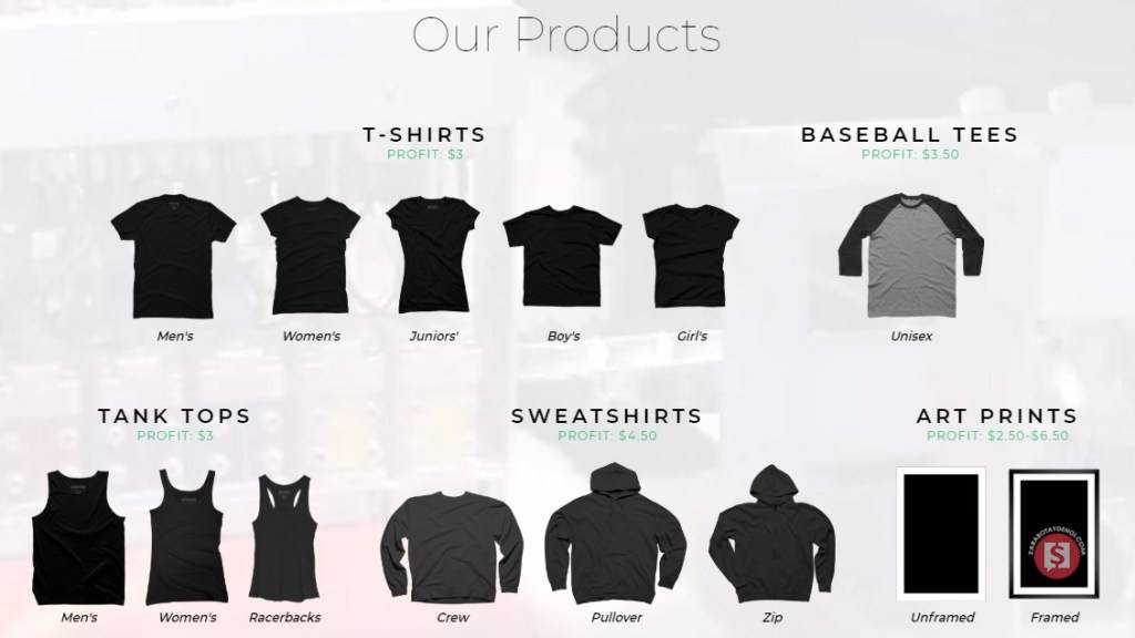 Цены на футболки устанавливаются художником, который продает дизайн — это означает, что цены могут варьироваться от 19 до 35 долларов за футболку. Вы можете заработать до 65% комиссии.