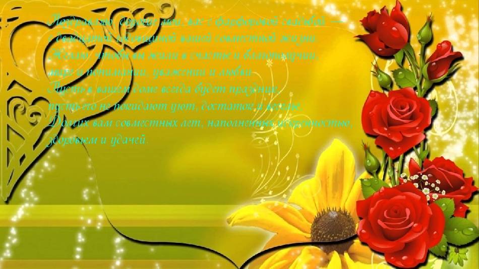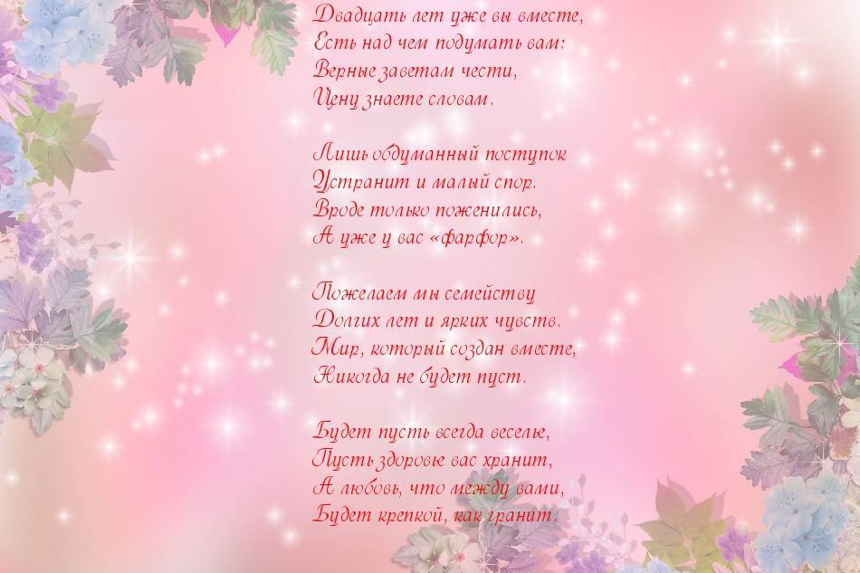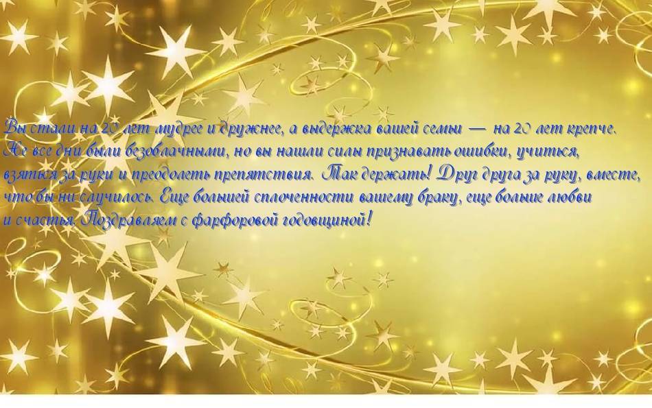 Но стоит помнить, что фарфор – достаточно хрупок, поэтому с ним нужно обращаться внимательно и аккуратно. Так и союз с 20-летним стажем требует бережного «отношения» к себе: супруги должны ценить и понимать друг друга, идти на уступки и находить компромисс в любом споре, тогда их брак продлится еще много-много лет.