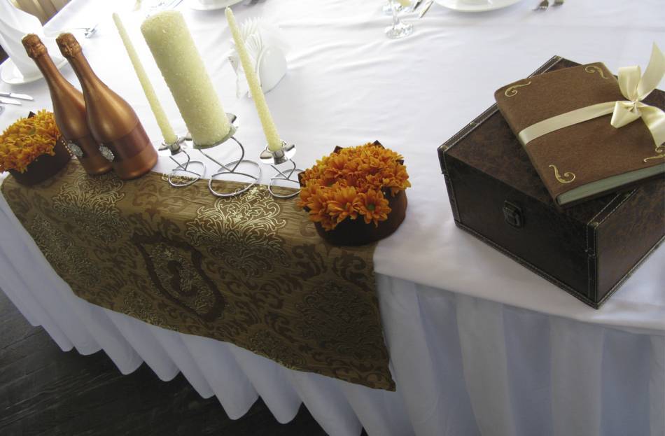 Стол можно начинать сервировать ближе к вечеру. Идеально, если удастся раздобыть скатерть бронзового оттенка. Шары и ленты по всему дому соответствующих цветов помогут сделать праздник еще более тематическим и уютным.