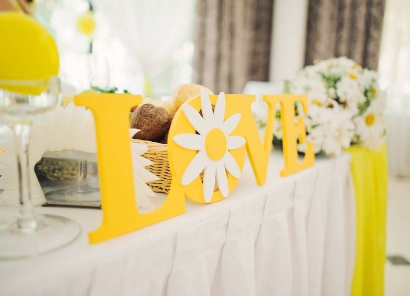 При подготовке торжественного вечера к фаянсу можно добавить и ромашки. Эти нежные цветы прекрасно будут смотреться в небольших вазах, расставленных по помещению, а также на расписных салфетках и других элементах декора. Выбирайте белые, бежевые и желтые оттенки.