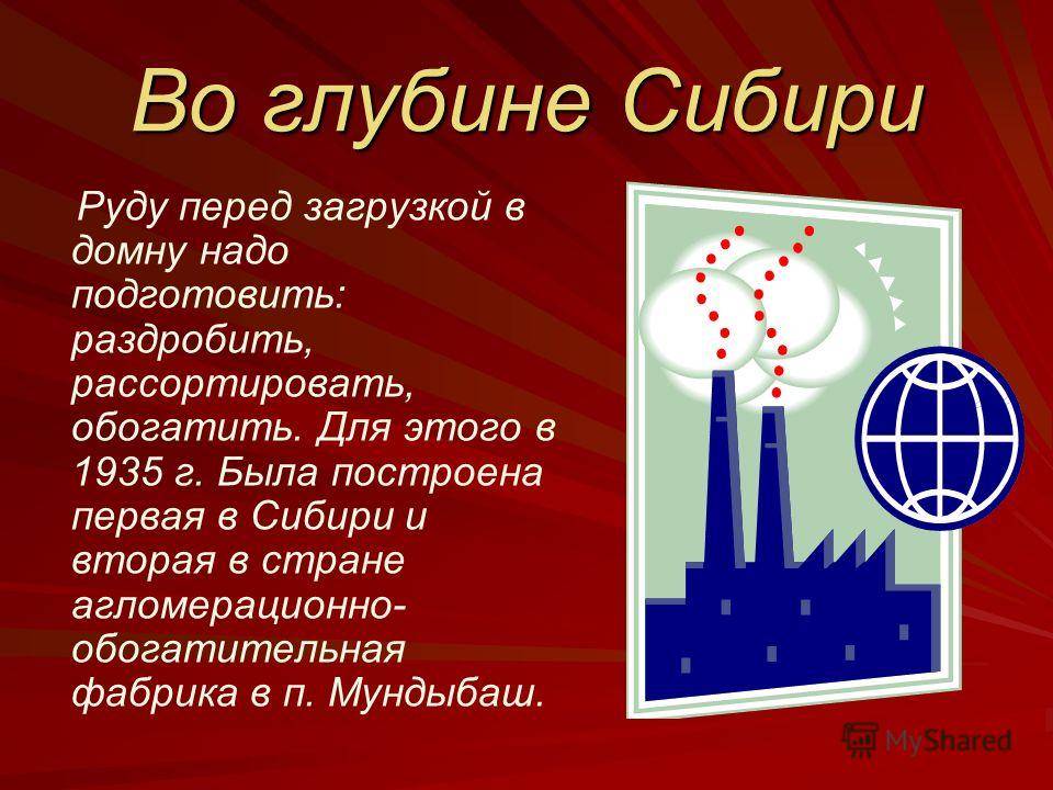 Во глубине Сибири Руду перед загрузкой в домну надо подготовить: раздробить, рассортировать, обогатить. Для этого в 1935 г. Была построена первая в Сибири и вторая в стране агломерационно- обогатительная фабрика в п. Мундыбаш.