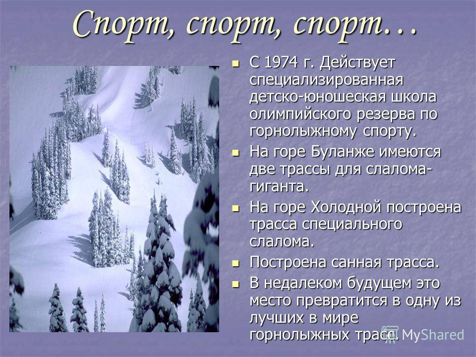 Спорт, спорт, спорт… Спорт, спорт, спорт… С 1974 г. Действует специализированная детско-юношеская школа олимпийского резерва по горнолыжному спорту. С 1974 г. Действует специализированная детско-юношеская школа олимпийского резерва по горнолыжному спорту. На горе Буланже имеются две трассы для слалома- гиганта. На горе Буланже имеются две трассы для слалома- гиганта. На горе Холодной построена трасса специального слалома. На горе Холодной построена трасса специального слалома. Построена санная трасса. Построена санная трасса. В недалеком будущем это место превратится в одну из лучших в мире горнолыжных трасс. В недалеком будущем это место превратится в одну из лучших в мире горнолыжных трасс.
