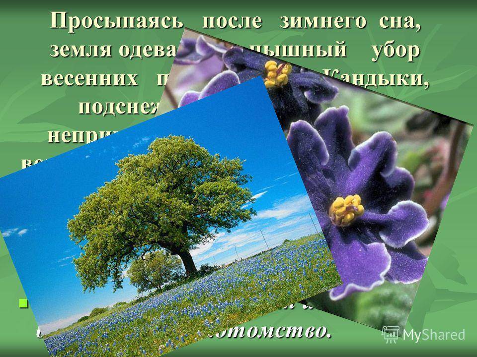 Просыпаясь после зимнего сна, земля одевается в пышный убор весенних первоцветов. Кандыки, подснежники, медунки своей неприхотливой красотой, как бы возвещают о возрождении природы. Птицы строят гнезда для нового выводка. Пчелы несут в улей первый взяток. А лесное зверье выводит из нор и берлог молодое потомство.