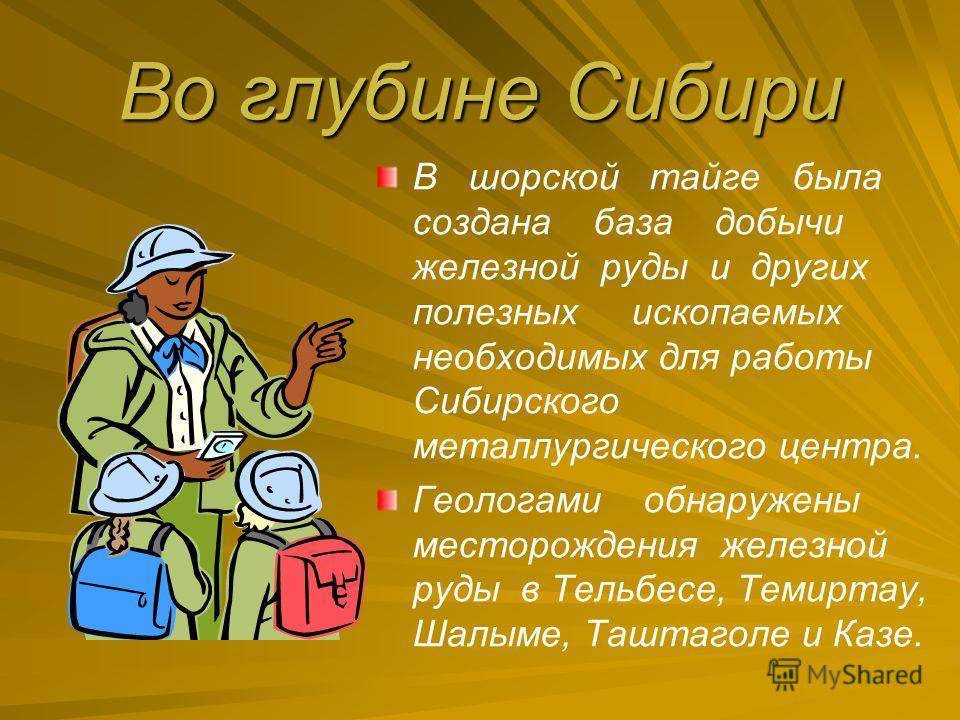 Во глубине Сибири В шорской тайге была создана база добычи железной руды и других полезных ископаемых необходимых для работы Сибирского металлургического центра. Геологами обнаружены месторождения железной руды в Тельбесе, Темиртау, Шалыме, Таштаголе и Казе.
