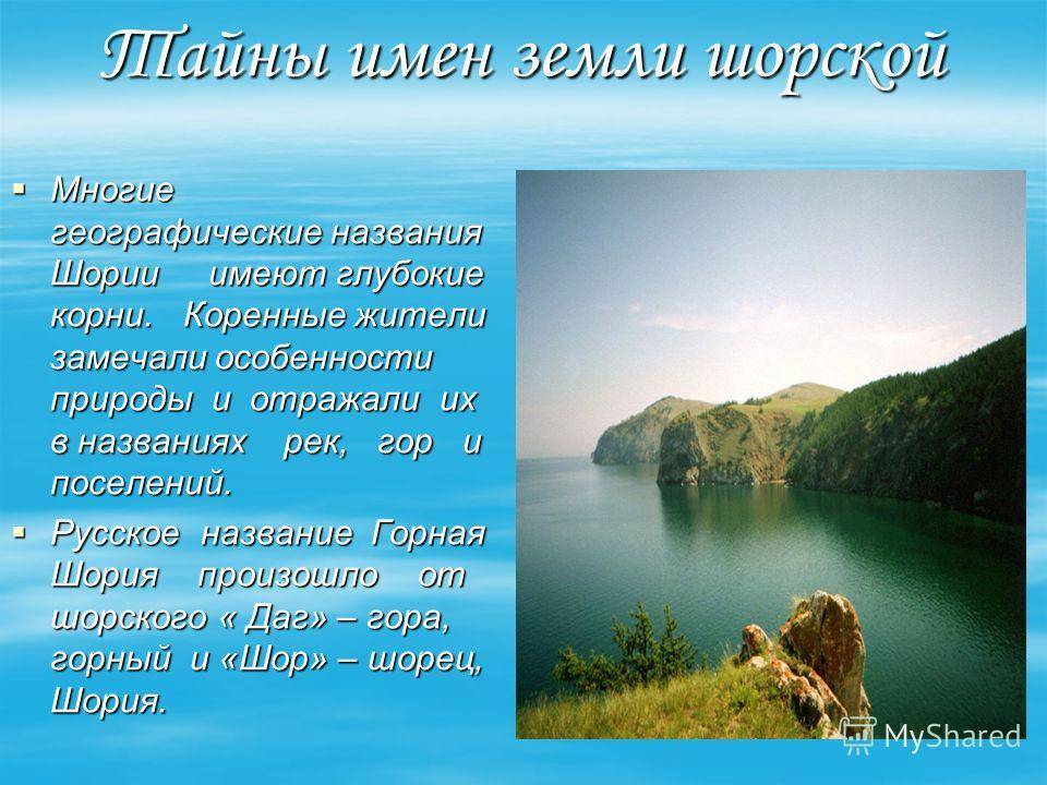Тайны имен земли шорской Многие географические названия Шории имеют глубокие корни. Коренные жители замечали особенности природы и отражали их в названиях рек, гор и поселений. Русское название Горная Шория произошло от шорского « Даг» – гора, горный и «Шор» – шорец, Шория.