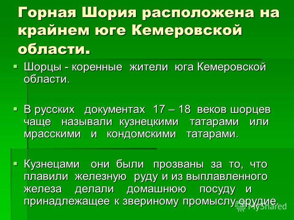 Горная Шория расположена на крайнем юге Кемеровской области. Шорцы – коренные жители юга Кемеровской области. В русских документах 17 – 18 веков шорцев чаще называли кузнецкими татарами или мрасскими и кондомскими татарами. Кузнецами они были прозваны за то, что плавили железную руду и из выплавленного железа делали домашнюю посуду и принадлежащее к звериному промыслу орудие.