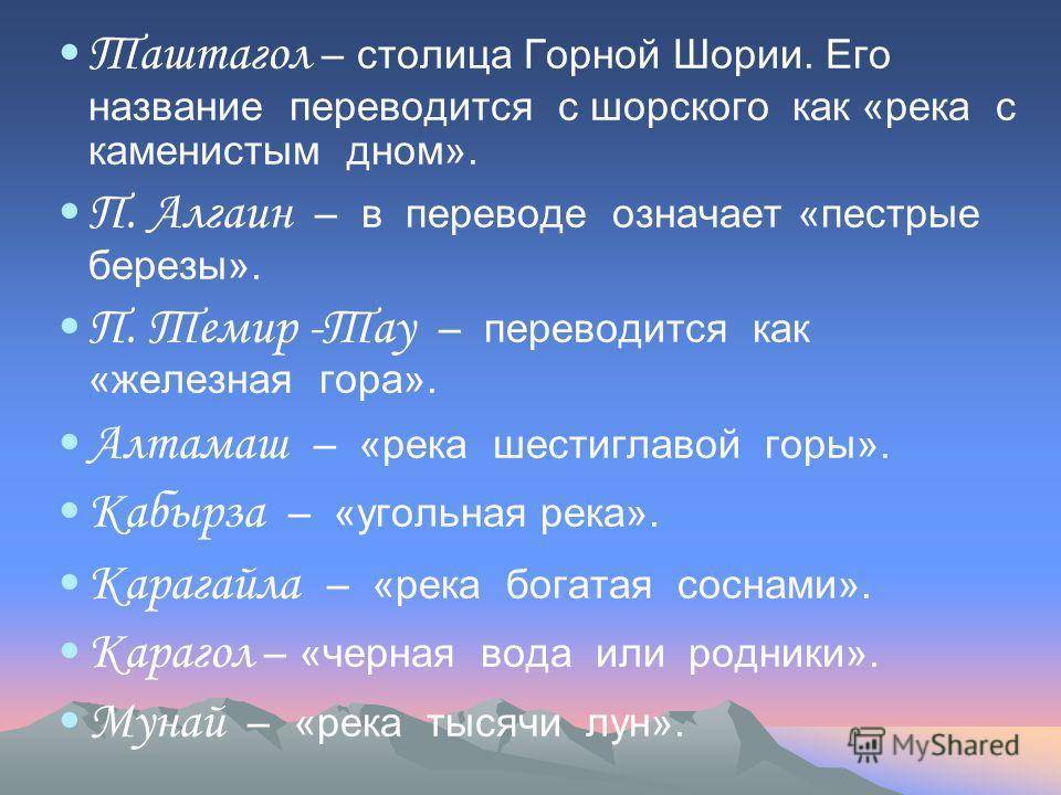 Таштагол – столица Горной Шории. Его название переводится с шорского как «река с каменистым дном». П. Алгаин – в переводе означает «пестрые березы». П. Темир -Тау – переводится как «железная гора». Алтамаш – «река шестиглавой горы». Кабырза – «угольная река». Карагайла – «река богатая соснами». Карагол – «черная вода или родники». Мунай – «река тысячи лун».