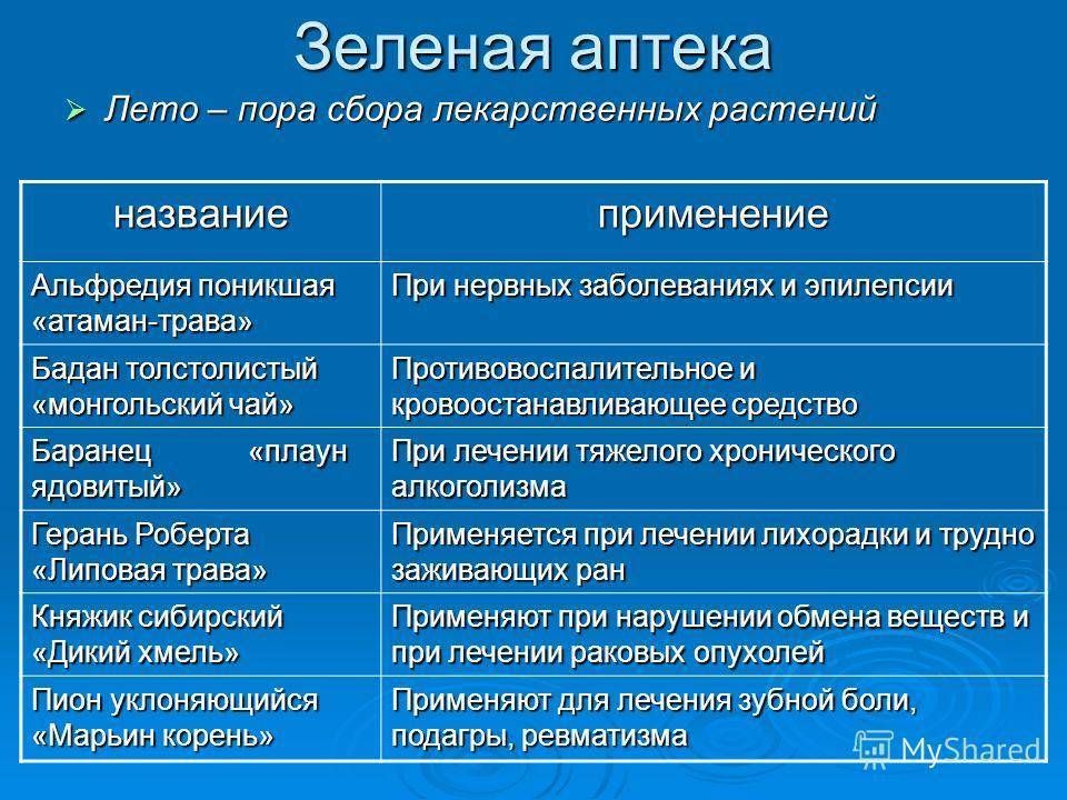 Зеленая аптека Лето – пора сбора лекарственных растений Лето – пора сбора лекарственных растений названиеприменение Альфредия поникшая «атаман-трава» При нервных заболеваниях и эпилепсии Бадан толстолистый «монгольский чай» Противовоспалительное и кровоостанавливающее средство Баранец «плаун ядовитый» При лечении тяжелого хронического алкоголизма Герань Роберта «Липовая трава» Применяется при лечении лихорадки и трудно заживающих ран Княжик сибирский «Дикий хмель» Применяют при нарушении обмена веществ и при лечении раковых опухолей Пион уклоняющийся «Марьин корень» Применяют для лечения зубной боли, подагры, ревматизма