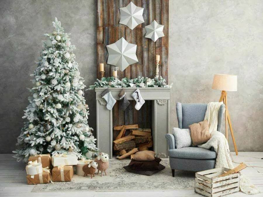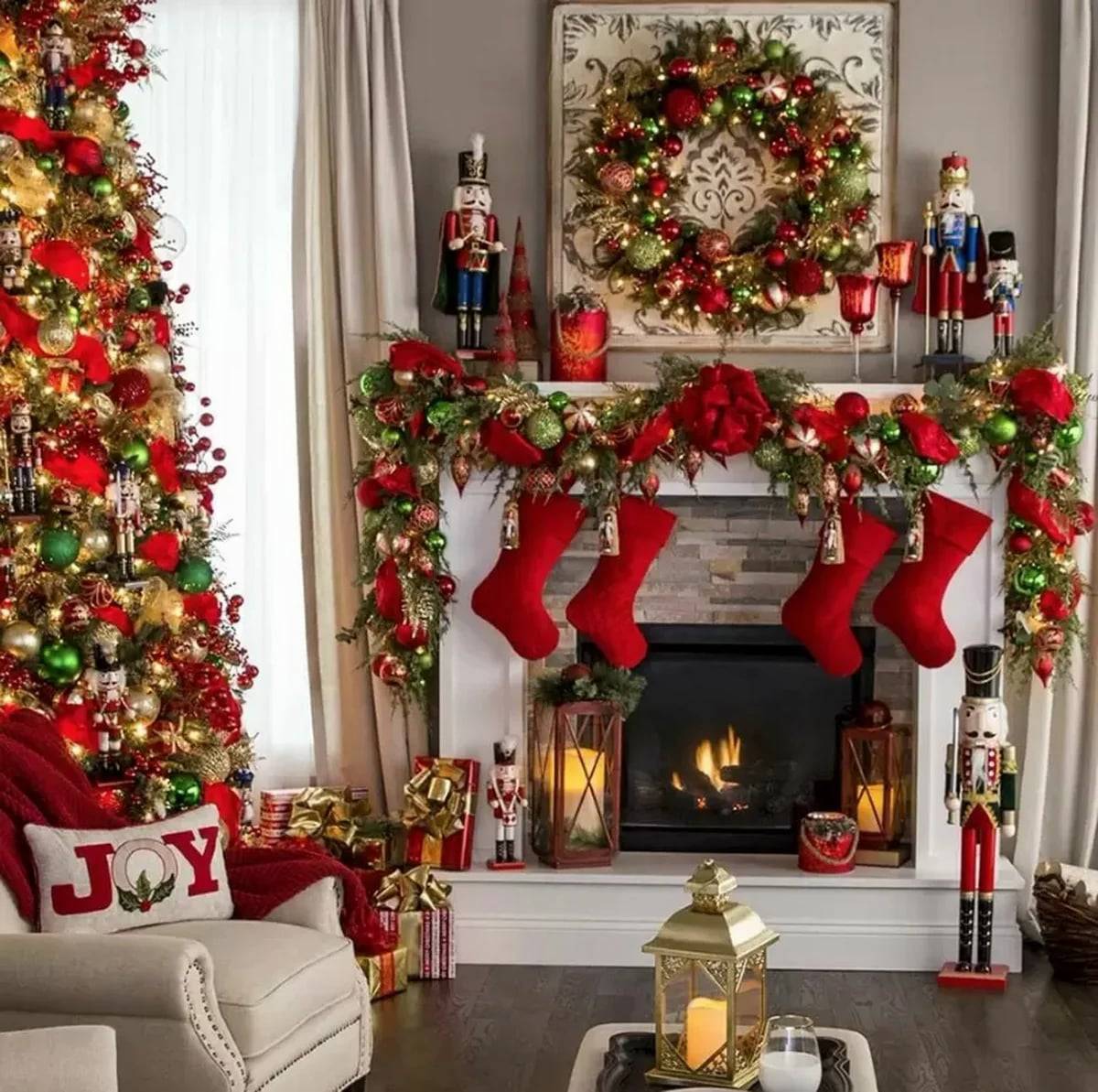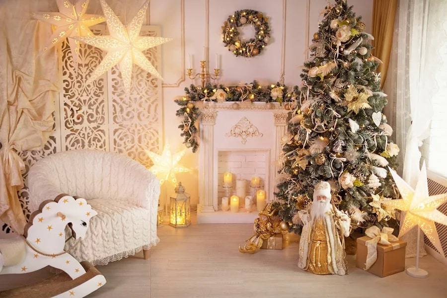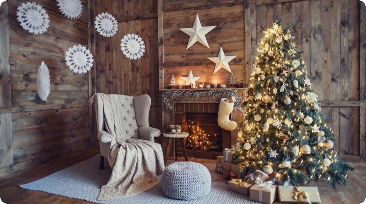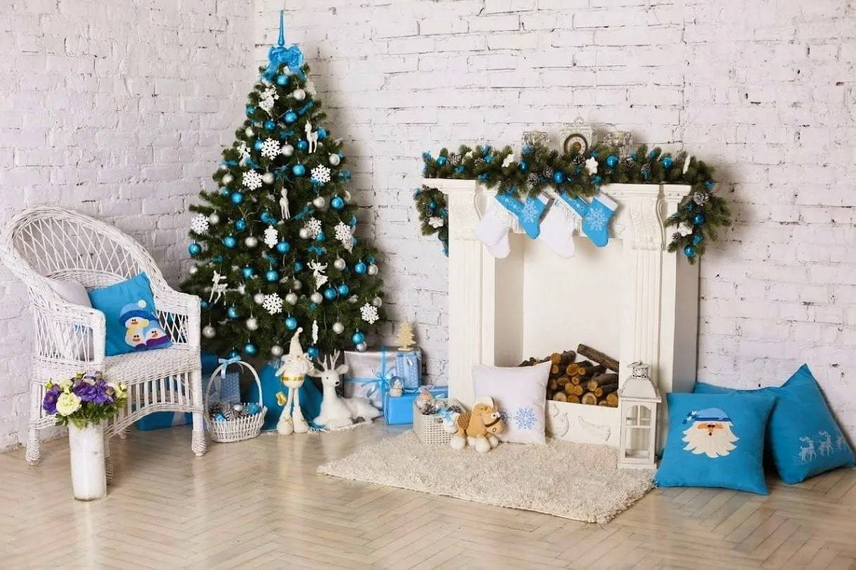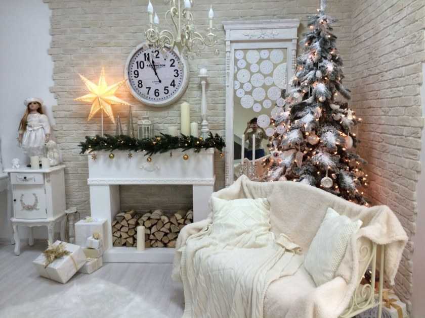 Уютная комната с камином. Камин — это атрибут, который ассоциируется с новогодними праздниками. На камин можно развешать носки для подарков и положить туда цветные леденцы в виде закрученных палочек.