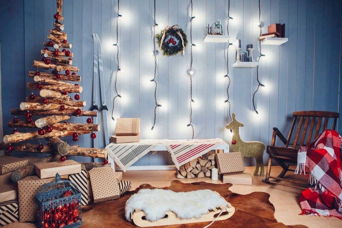 Лофт зона. Очень интересный вид декораций. Для их создания можно использовать любые подручные материалы. Очень популярны новогодние ели из деревянных реек и светодиодных гирлянд.