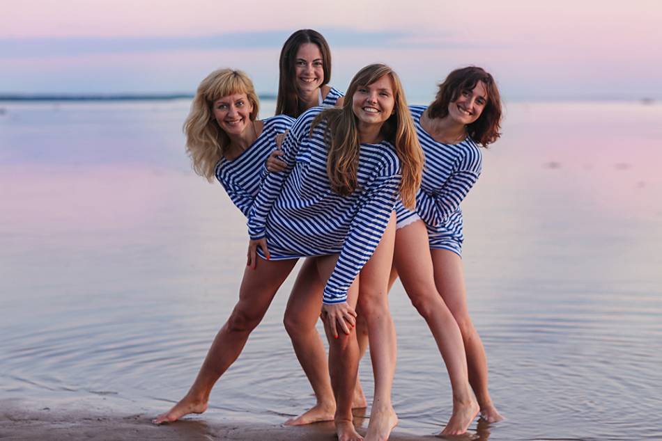 Девушки принимают лежачее положение, рядом с ними и на них просыпают лепестки, которые парни с завязанными глазами собирают без помощи рук по поданной команде.