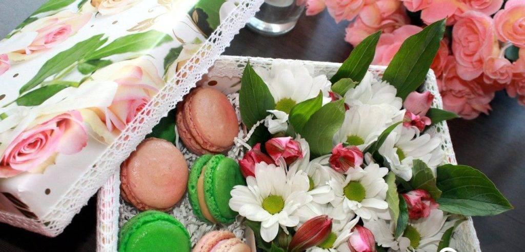 - Набор из макарунов и цветов. Такие наборы можно найти во многих онлайн-магазинах, но если не хотите переплачивать, то сделайте его своими руками. Купите небольшую коробку, вложите в нее оазис для цветов (продается в магазинах для флористов) пропитанный водой. Он должен занимать чуть больше, чем пол коробки. Аккуратно обрежьте цветы, оставляя только маленький хвостик, и вставьте их в оазис. Оставшееся место заполните цветными макарунами и можно вручать начальнице или коллеге-подруге.