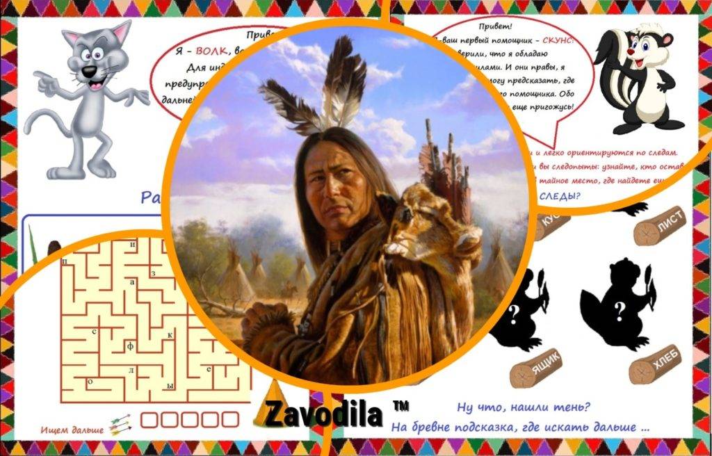 ◊ Индейская загадка — по загадочным и двусмысленным словам в стихотворной форме догадаться, о чем идет речь.◊ Следопыты — по отпечаткам нижних конечностей, узнать кому именно они принадлежат.◊ Найди отличие — из одинакового, на первый взгляд, количества однотипных картинок выбрать ту, которая при более внимательном изучении имеет различия от остальных.◊ Овощной кроссворд — по краткому описанию отгадать, какие овощи предпочитали индейцы в своем меню.◊ Индейский ребус — зашифрованное слово, разгадать которое можно с помощью картинки и обозначенных знаков, символов.◊ Найди пару — каждому животному необходимо найти свой домик и по пути собрать слово-шифр.◊ Мини-сканворд с игрой букв — по представленным картинкам правильно расставить буквы в их названии, чтобы собрать слово-шифр, которое приведет к очередному месту тайнику.◊ Загадочный лабиринт — продумать правильный ход, чтобы избежать ловушек и тупиков и собрать слово, которое откроет место тайник.◊ и другие интересные задания.Задания для квеста были специально разработаны для детей до 10 лет включительно, и имеют познавательно-развивающуюся информацию.
