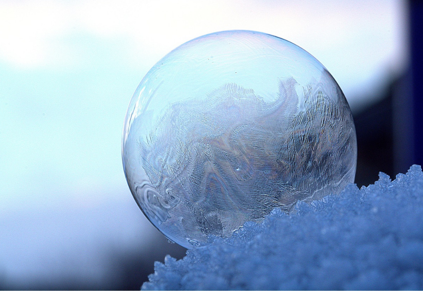 Для осуществления этого приема нужна минусовая погода. Поэтому, это действие замечательно выполнять зимой. Выходим на улицу в мороз и начинаем дуть пузыри. Одновременно с появлением пузыря на нем будут образовываться кристаллы, которые мгновенно разрастутся и покроют всю поверхность пузыря.