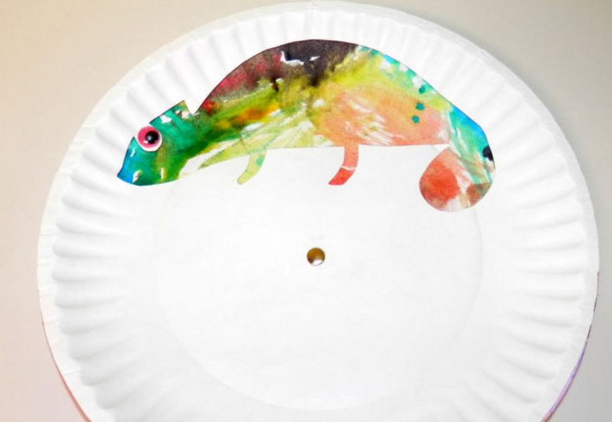 - Налепите на хамелеонов глаза и медленно крутите, наблюдая, как меняются цвета у бумажного хамелеона.