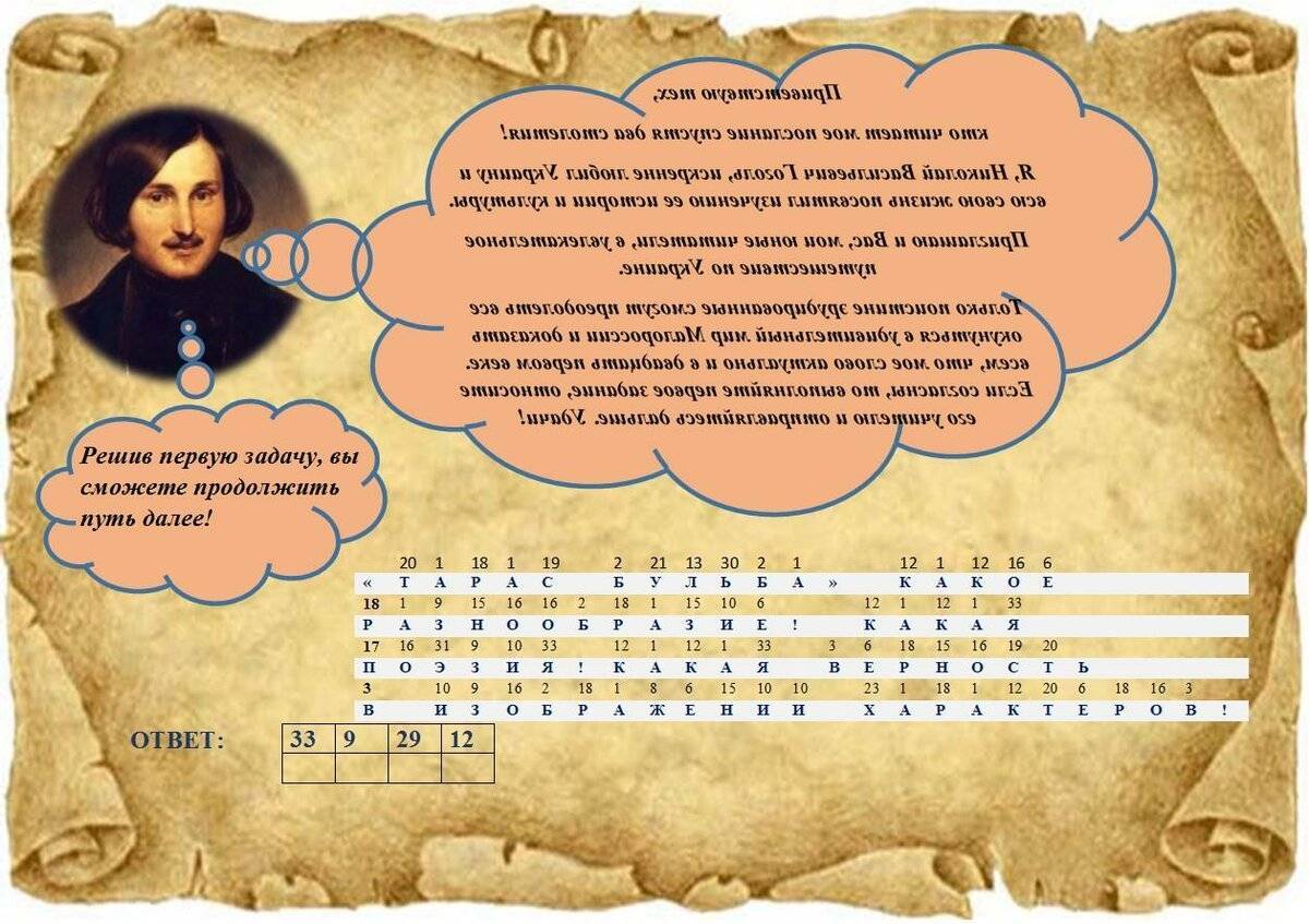 Описание заданий в квесте:◊ Урок географии — веселое задание на ассоциативное мышление, в котором ученикам необходимо по изображению достопримечательностей разных стран узнать, что это за страна и вписать их название в ячейки для ответа. Угадав все страны верно, с помощью специального шифра можно будет узнать, кто из учителей хранитель следующего тайника или узнать название тайника.◊ Урок математики — логическое задание, в котором ученикам предстоит решить забавное уравнение, переменными которого выступают даты любимых праздников. Решив верно математическое уравнение, старшеклассники узнают девятизначное число, которое поможет расшифровать, кто из учителей хранитель следующего тайника или узнать название секретного тайника.◊ Урок физики — задание на логику и внимательность. В этом задании участникам предстоит вспомнить физиологические свойства жидкости и определить очередность наполнения стаканов. Порядковый номер стакана, который наполнится первым подскажет, кто из учителей хранитель следующего тайника или узнать название секретного тайника.◊ Урок физкультуры — задание на внимательность, в котором нужно указать причастность разновидности мячей к спортивным играм. Если сделать все правильно, то сразу станет известно, где спрятан секретный тайник или кто из учителей следующий хранитель тайника.◊ Урок истории — задание на логику и знания истории, в котором нужно найти пару каждому Богу и Богине Египта по их историческому описанию, чтобы узнать, где спрятан секретный тайник или кто из учителей следующий хранитель тайника.◊ Урок биологии — задание на внимательность, в котором нужно помочь пчелке собрать нектар с белых ромашек. Если проложить путь верно, то такой полет пчелки обязательно подскажет, где спрятан следующий секретный тайник.◊ Урок английского — задание на знание начального английского. Разгадав веселые английские загадки и записав ответ на каждую из них на русском языке, станет известно, кто хранитель тайника или где спрятан секретный тайник.◊ Урок химии — интересное задание на знание предупреждающих знаков. К примеру, радиация, ядовитые вещества, биологическая опасность и т.д. Ученикам предстоит правильно определить какой знак, какую текстовую информацию несет. Если правильно совместить текстовое предупреждение с изображением таких знаков, участники узнают название секретного тайника или кто хранитель следующего тайника.◊ Урок литературы — задание на знание имен поэтов и писателей. Если найти ошибку в каждой фамилии и выбрать из списка верное имя каждому поэту и писателю, то участники смогут расшифровать, где следующий секретный тайник.◊ Шифротекст — завершающая головоломка, в которой участникам предстоит расшифровать изображенный текст на школьном компьютере. Сделав расшифровку с помощью англоязычной раскладки клавиатуры, получившийся текст подскажет, где спрятан секретный тайник.
