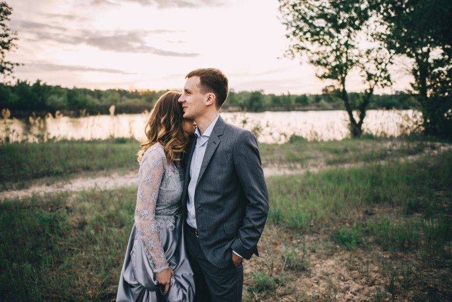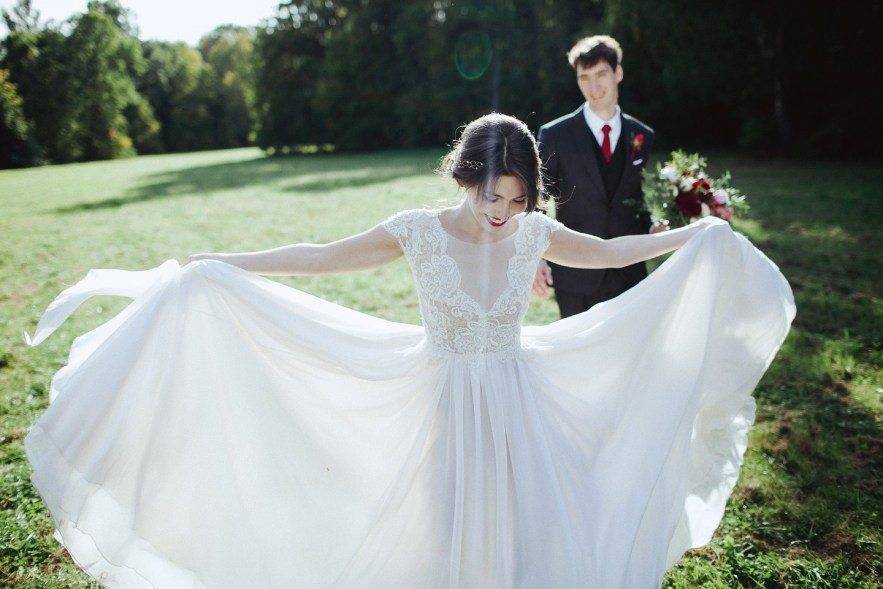 Небольшая свадьба может быть мероприятием со свободным дресс-кодом. Если вы не хотите облачаться в платье, делающее вас похожей на пирожное, то выберите классическое светлое вечернее платье, добавив фату и стильные украшения. Обувь нужно покупать с расчетом на ношение и после торжества (кремовые, бежевые туфли на устойчивом каблуке). Для бюджетной свадьбы молодые на фото выше выбрали стиль рустик.